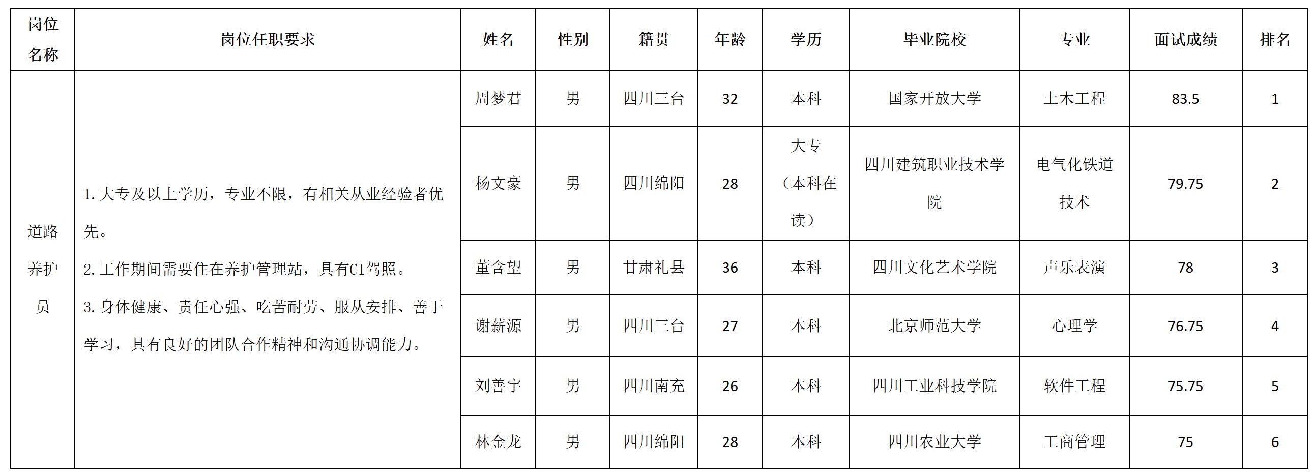 根據(jù)2025年退役軍人就業(yè)服務(wù)專項行動——“戎耀歸蜀”綿陽退役軍人及軍屬招聘活動及綿陽路橋建設(shè)集團(tuán)有限責(zé)任公司招聘相關(guān)規(guī)定,經(jīng)面試程序,現(xiàn)將面試成績予以公示。