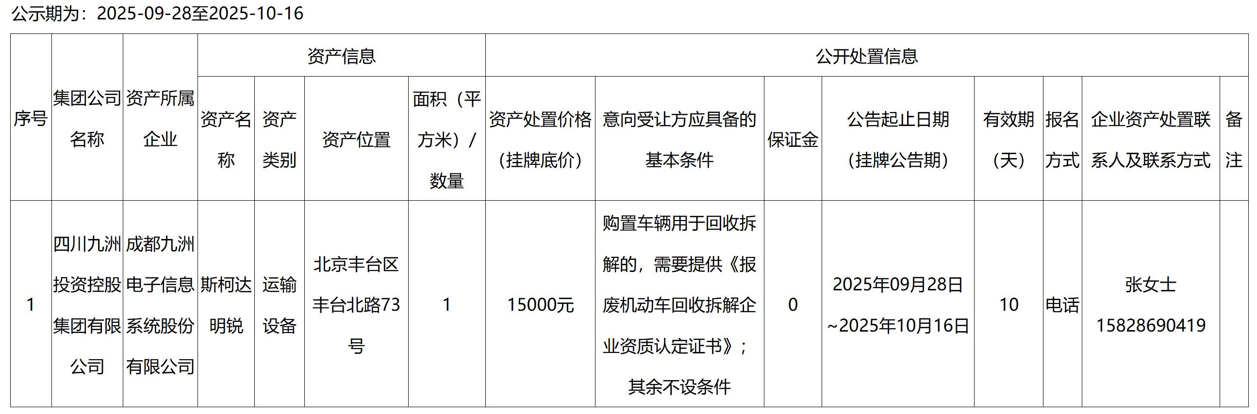 成都九洲電子信息系統(tǒng)股份有限公司北京車輛處置公告