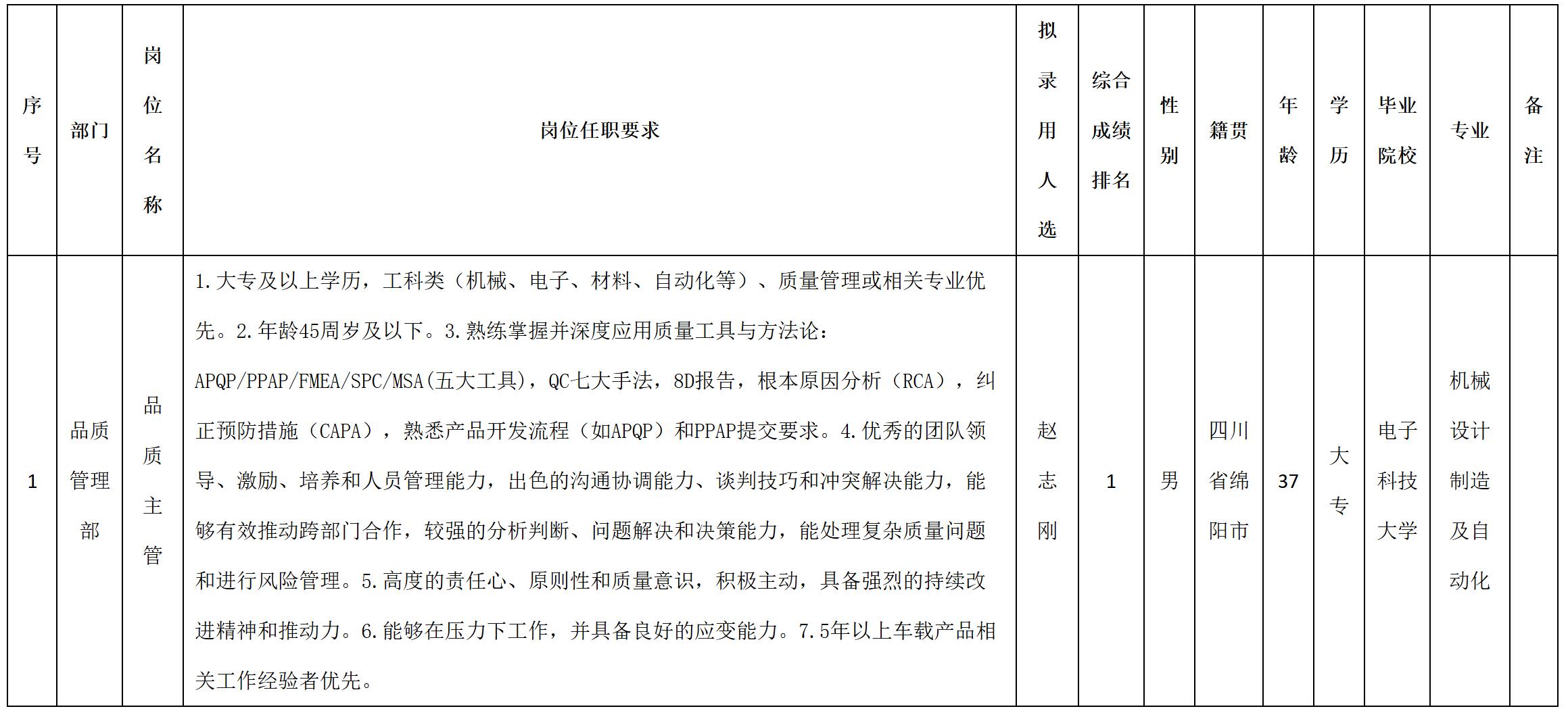 根據(jù)四川安和精密電子電器股份有限公司發(fā)布的招聘公告及招聘相關(guān)規(guī)定,經(jīng)測(cè)試、考察、體檢等程序,擬錄用趙志剛同志到四川安和精密電子電器股份有限公司工作,現(xiàn)予以公示,具體情況如下: