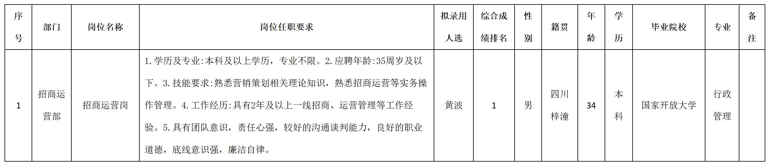根據(jù)四川九洲千城商業(yè)管理有限公司發(fā)布的招聘公告及招聘相關(guān)規(guī)定,經(jīng)測(cè)試、考察、體檢等程序,擬錄用黃波同志到四川九洲千城商業(yè)管理有限公司工作,現(xiàn)予以公示,具體情況如下: