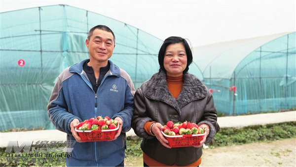 何躍斌、唐琪芳夫婦展示采摘的草莓。