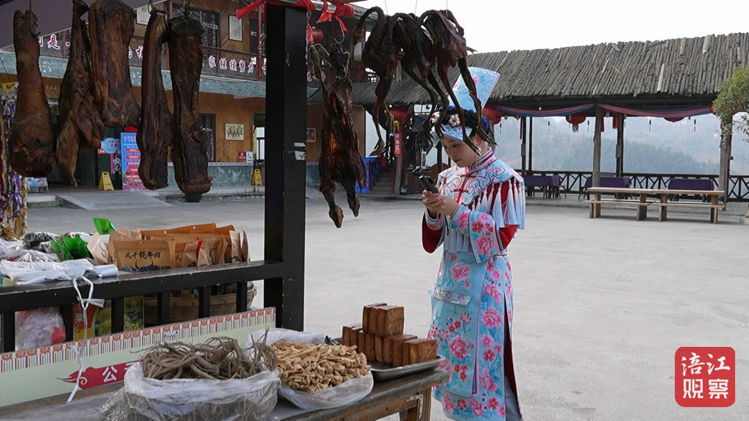 00后羌族姑娘陳新一站在鏡子前換上艷麗的羌服,隨后提著攝像設(shè)備走進村里一戶羌家的臘肉炕房。灶臺上,懸掛著一排排色澤紅潤的臘肉,陽光透過窗欞灑在臘肉上,透出誘人的光澤。她舉起相機,一邊調(diào)整角度,一邊與正在熏肉的婆婆聊天。