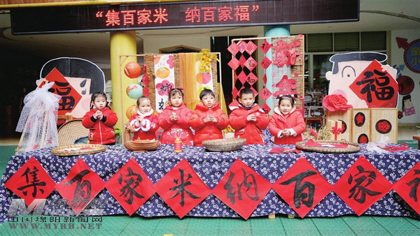 三臺縣機關(guān)幼兒園的孩子們體驗“集百家米納百家福”民俗。 記者 劉鳳君 攝