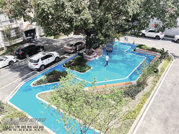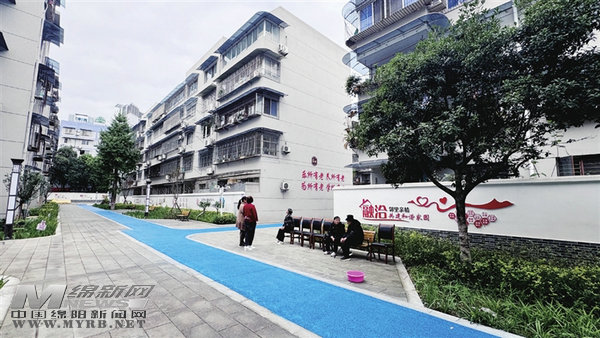 冬日午后,涪城區(qū)荷花中街11號朝陽軍干所小區(qū)暖意融融,幾位老人圍坐在新建長椅上曬太陽。藍色透水步道串聯(lián)樓棟,生態(tài)草溝隱匿于綠植間,曾經(jīng)老化破損的管網(wǎng)、濕滑積水的路面早已換新顏。