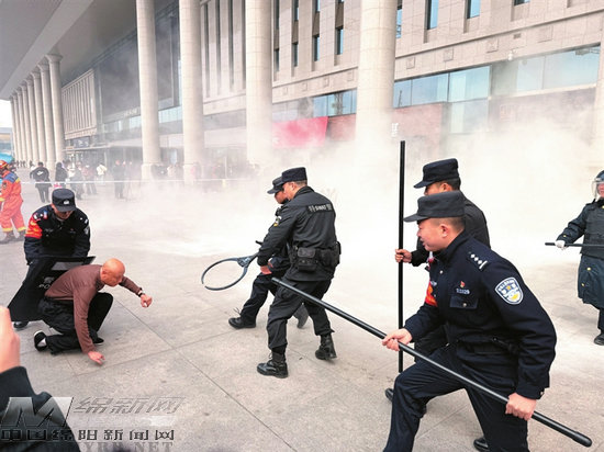 反恐防暴綜合演練現(xiàn)場模擬一名“暴徒”攜帶管制刀具闖入火車站。特巡警隊員迅速反應(yīng),與鐵路公安、消防、醫(yī)療等力量形成聯(lián)動。只見他們手持防暴盾牌,迅速組成防御陣型,隨后對“暴徒”進行警告。“暴徒”負隅頑抗,特巡警隊員們訓練有素、配合默契,最終成功將其制服。整個過程緊張有序,各環(huán)節(jié)銜接緊密,充分展現(xiàn)了多單位協(xié)同作戰(zhàn)能力,讓在場觀看的群眾情不自禁地鼓掌。