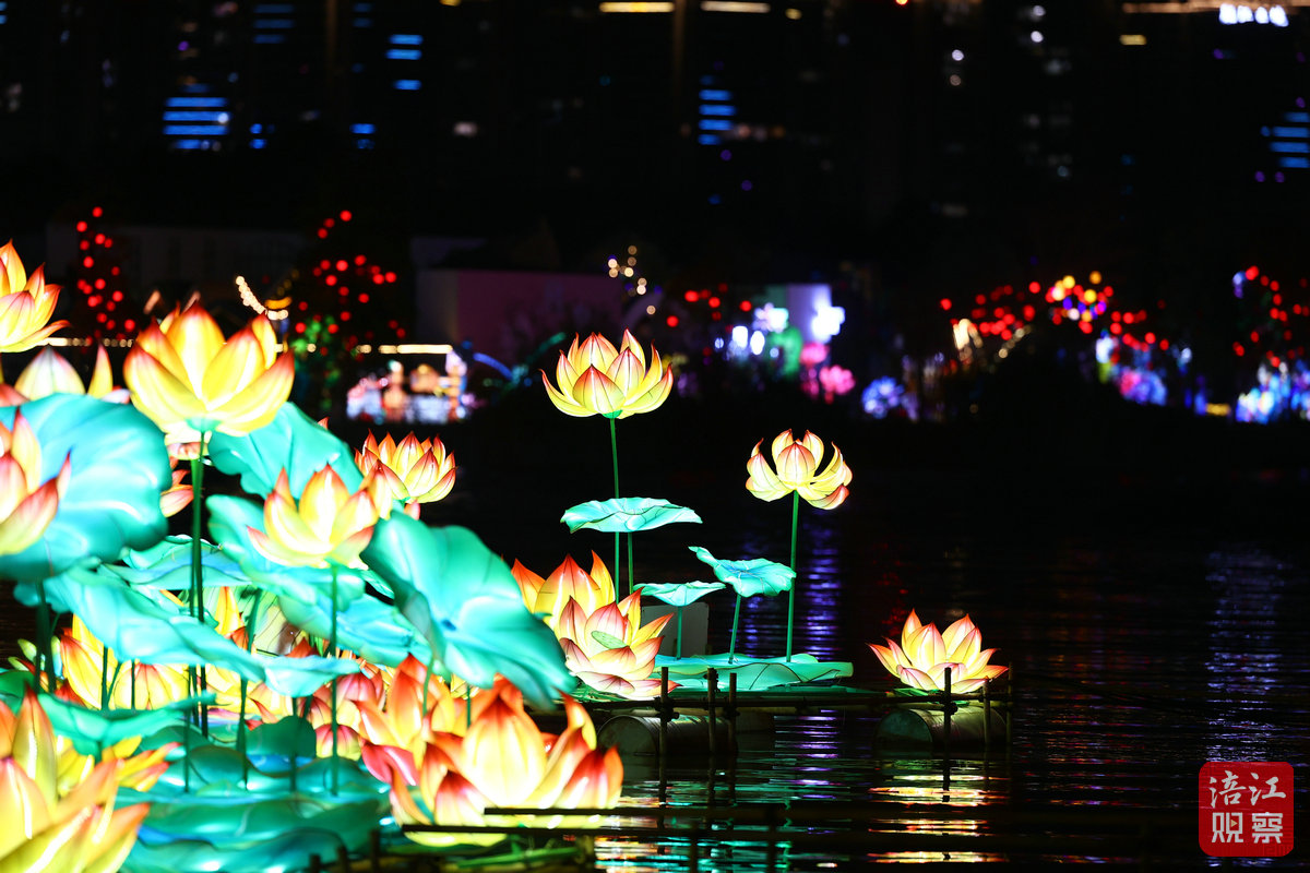 “詩韻長廊”以荷花彩燈襯詩詞卷軸,杜甫《越王樓歌》、羅隱《綿谷回寄蔡氏昆仲》的千古佳句隨光影流轉(zhuǎn);