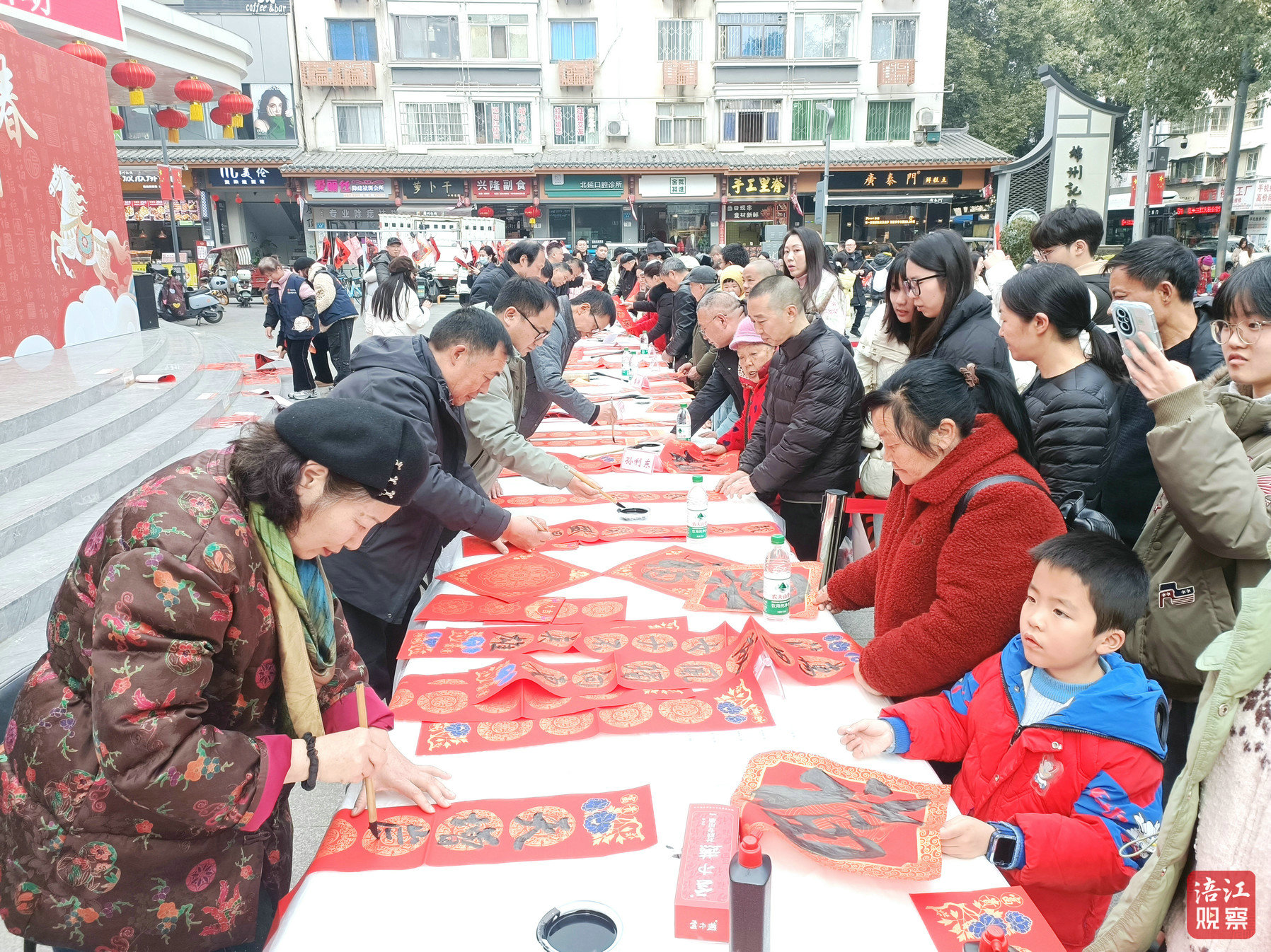 現(xiàn)場長桌排開,書法家們凝神聚氣,筆走龍蛇。不一會兒,“春回大地千山秀,馬躍長空萬象新”“駿馬奔騰開勝景,春風(fēng)浩蕩展宏圖”等傳統(tǒng)佳句躍然紙上,濃濃的墨香與鮮艷的紅色交織,傳遞出對新一年的美好祈愿。
