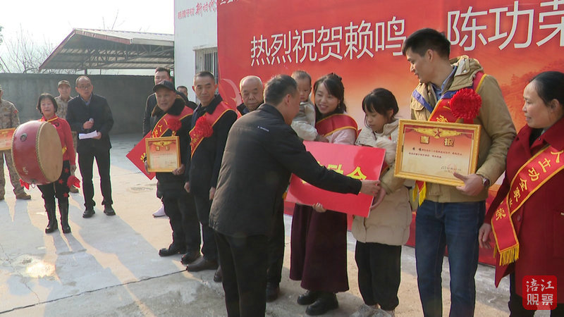 在村委會前的廣場上,立功軍人代表賴鳴身披紅色綬帶、胸戴大紅花,雙手捧著兩張金色邊框的二等功喜報,神情莊重而自豪。現(xiàn)場村民、干部紛紛拿出手機拍照留念,記錄下這一榮耀時刻。