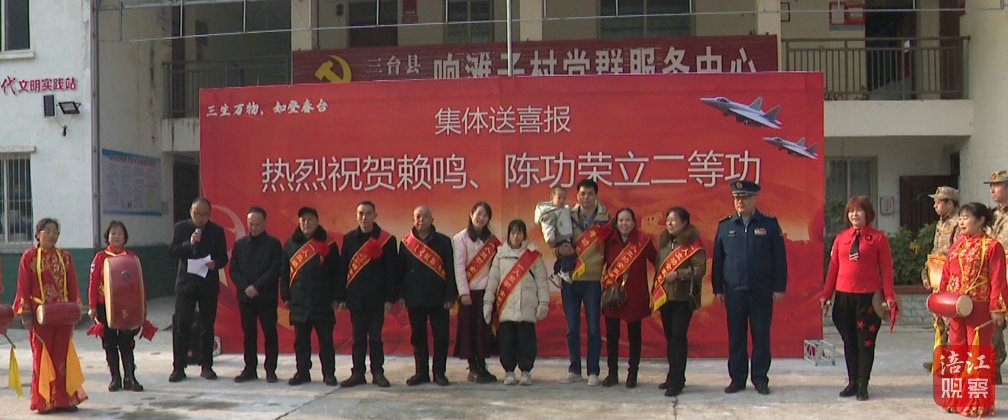 2月11日上午,綿陽市三臺縣樂安鎮(zhèn)響灘子村村委會門前喜氣洋洋,鑼鼓喧天。在村黨群服務(wù)中心前的紅色背景板前,“集體送喜報 熱烈祝賀賴鳴、陳功榮立二等功”幾個大字格外醒目。背景板上黨徽閃耀、戰(zhàn)機翱翔,彰顯著軍人的榮耀與擔(dān)當(dāng)。