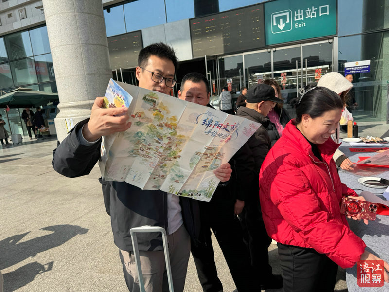 活動(dòng)現(xiàn)場(chǎng),書法家揮毫潑墨,將一副副寓意吉祥的春聯(lián)和“福”字送到旅客手中。來自山東的游客陳瓊接過手繪的綿陽游覽地圖,仔細(xì)翻閱后表示:“這份地圖太貼心了,我會(huì)按著上面的推薦去逛逛綿陽的美景,嘗嘗綿陽的美食。”他一邊翻看地圖,一邊計(jì)劃著春節(jié)假期的行程。