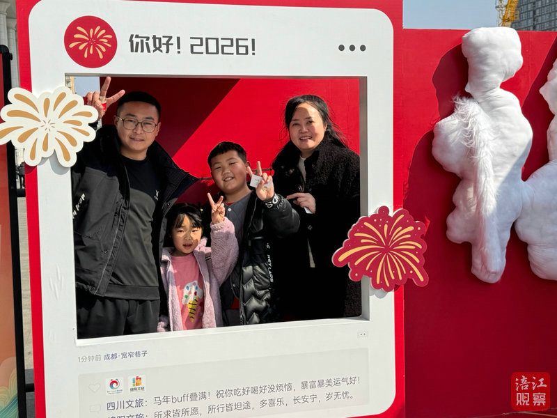 不遠(yuǎn)處的“青睞綿陽”宣傳展板前,從外地返鄉(xiāng)的敬女士一家正在合影留念。“這個(gè)宣傳很及時(shí),春節(jié)假期我們正好可以帶家人去玩一玩。”敬女士說,她和丈夫常年在外工作,這次回家看到家鄉(xiāng)的文旅推廣,感到既親切又自豪。她的兩個(gè)孩子舉著福字,興奮地對(duì)著鏡頭比出“V”字手勢(shì)。