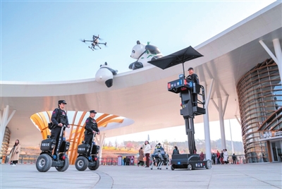 民警在綿陽中華大熊貓?jiān)吠ㄟ^先進(jìn)警用裝備執(zhí)勤,維護(hù)景區(qū)秩序。 記者 劉晏男 攝