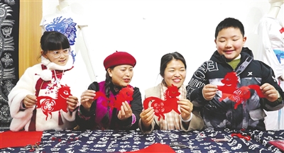 蘭小奇(左二)創(chuàng)作的馬年主題剪紙作品。 記者 李春梅 攝