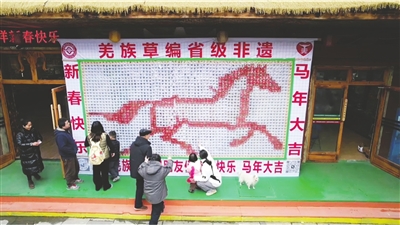 省級非物質(zhì)文化遺產(chǎn)代表性傳承人黃強說:“制作這幅‘駿馬送祝福’文化墻,一方面是想用羌族草編非遺技藝迎接馬年新春,為廣大游客送上新年的美好祝福;另一方面也是想通過這樣的創(chuàng)意作品,讓更多的人了解、喜愛羌族草編,讓非遺技藝在新時代更好地傳承與發(fā)展。”