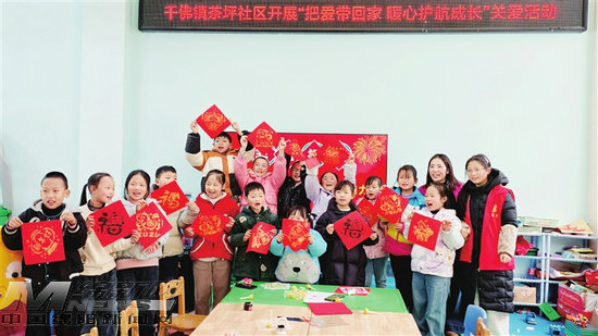 茶坪社區(qū)兒童之家,張春紅(右二)帶孩子們寫春聯(lián)做剪紙。記者 楊方彧 攝
