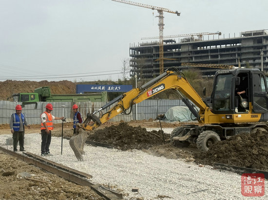 記者在現(xiàn)場看見,數(shù)十名施工人員佩戴好安全帽忙碌在各個角落,挖掘機、渣土車等工程車輛往來穿梭,主體施工區(qū)域的作業(yè)面全面鋪開,一派繁忙景象。