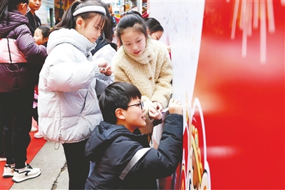 校門口“馬上有福”互動(dòng)墻前熱鬧非凡,孩子們將寫滿心愿的紅色卡片貼在墻上,承載著對(duì)新學(xué)期的憧憬。不同字體的“馬”字吸引大家駐足,孩子們描摹漢字、合影留念,定格開學(xué)美好瞬間。學(xué)生蔣樂湉說,回到校園見到老師同學(xué),滿心歡喜與期待。