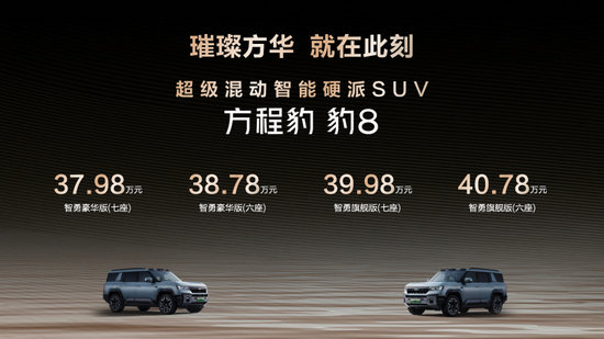 11月12日,比亞迪華為聯(lián)合發(fā)布方程豹豹8上市,共發(fā)布4個(gè)款型,其中智勇旗艦六座版40.78萬(wàn)元、智勇旗艦七座版39.98萬(wàn)元、智勇豪華六座版38.78萬(wàn)元、智勇豪華七座版37.98萬(wàn)元。作為比亞迪30周年的旗艦之作,比亞迪華為首次聯(lián)合開(kāi)創(chuàng)的智能硬派,豹8定義了國(guó)貨旗艦的頂級(jí)價(jià)值,開(kāi)創(chuàng)了自己的價(jià)值公式——8=4x(1+1)。1臺(tái)豹8等于 4大王牌科技,乘以1套全家舒享豪華配置加1個(gè)非承載式硬派車身,以“智勇雙全”的非凡實(shí)力,引領(lǐng)全新生活方式,開(kāi)啟全球智能硬派新時(shí)代。