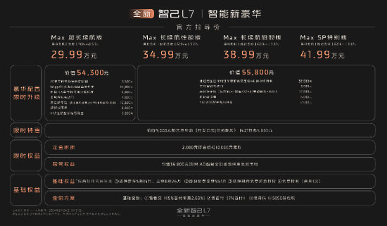 全新智己L7共推出4個版本:全新智己L7 Max 超長續(xù)航版售價29.99萬元,全新智己L7 Max 長續(xù)航性能版售價34.99萬元,全新智己L7 Max 長續(xù)航旗艦版售價38.99萬元,全新智己L7 Max SP特別版售價41.99萬元。發(fā)布會上,智己汽車公布了極具誠意的限時上市權(quán)益,即日起至3月31日,下定全新L7,尊享至高價值6.38萬元限時購車好禮,包括全系享2000元訂金抵扣1萬元尾款,最高價值達5.58萬元的豪華配置升級特惠以及IM AD智能駕駛?cè)δ馨K身免費使用等福利。