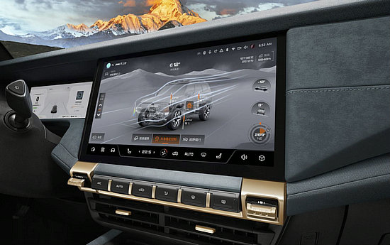 內(nèi)飾方面,屏幕采用內(nèi)嵌式設(shè)計,擁有 14。6 英寸超大屏幕尺寸,更簡潔牢靠,屏幕下方集成了大部分日常的功能按鍵,物理按鍵操控起來觸感更真實,更好的彰顯了 G318 科技與硬派合而兼得的特點。