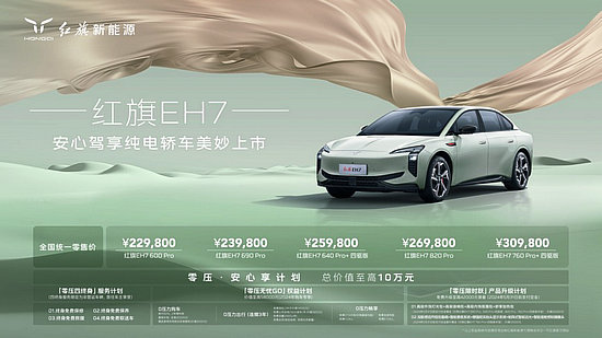 3月20日,紅旗新能源在深圳市民廣場舉行“安心駕享·紅旗EH7上市發(fā)布會”,紅旗新能源品牌首款戰(zhàn)略車型——“安心駕享純電轎車”紅旗EH7正式發(fā)布,全國統(tǒng)一零售價為22。98萬-30。98萬元,特別推出的“零壓安心享”計劃,紅旗EH7用戶最高可享價值10萬元的權(quán)益。