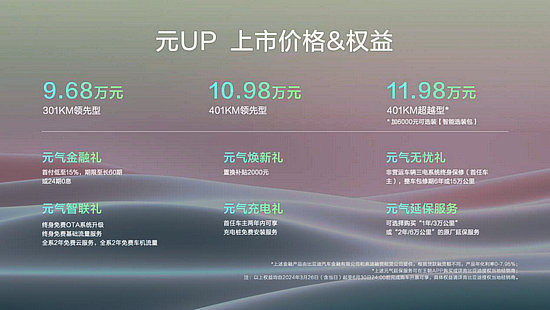 3月26日,比亞迪首款搭載e平臺(tái)3。0的A0級(jí)純電SUV——元UP正式上市。新車共有3個(gè)款型,官方指導(dǎo)價(jià)9。68萬(wàn)元—11。98萬(wàn)元。同時(shí),官方還推出了元?dú)饨鹑诙Y、元?dú)鉄ㄐ露Y、元?dú)鉄o(wú)憂禮、元?dú)庵锹?lián)禮、元?dú)獬潆姸Y、元?dú)庋颖7?wù)六大上市權(quán)益。
