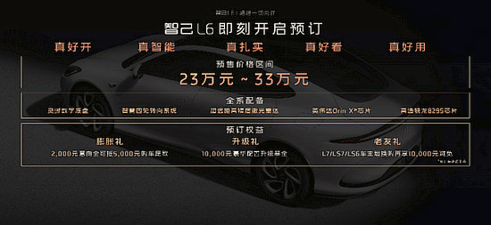 當日,智己L6正式開啟預(yù)售,預(yù)售價格區(qū)間:23萬元~33萬元。智己L6 Max標準版,不超過23萬元;智己L6 Max超強性能版,不超過29。99萬元;智己L6 Max光年版,不超過33萬元。同期,也公布了極具誠意的“限時預(yù)訂權(quán)益”,2000元意向金即可抵5000元購車尾款,以及10000元豪華配置升級基金。