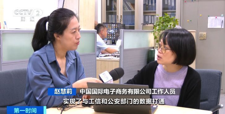 中國國際電子商務(wù)有限公司工作人員 趙慧莉:我們這個平臺運(yùn)用大數(shù)據(jù)技術(shù),實(shí)現(xiàn)了與工信和公安部門的數(shù)據(jù)打通,能夠?qū)崿F(xiàn)在線數(shù)據(jù)的核查比對,為地方商務(wù)主管部門高效審核提供支持。