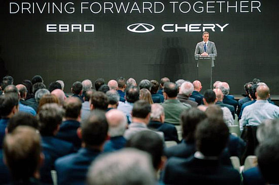 4月19日,在西班牙巴塞羅那自由貿(mào)易區(qū),西班牙首相桑切斯出席中國(guó)奇瑞汽車公司與西班牙埃布羅公司電動(dòng)汽車合作協(xié)議簽字儀式時(shí)致辭。新華社發(fā)(胡安·戈薩攝)