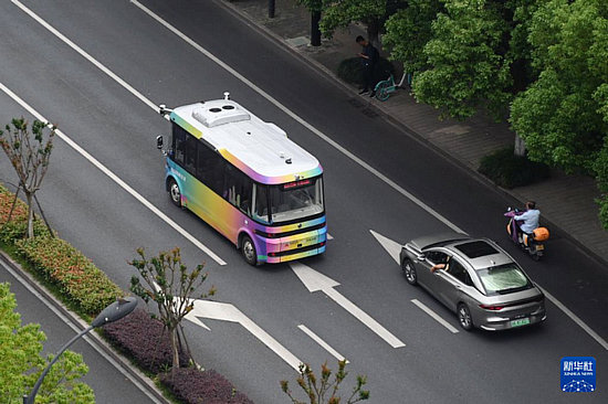 5月22日,自動駕駛接駁示范線巴士行駛在杭州余杭未來科技城的道路上。