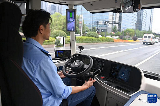 5月22日,在杭州余杭未來科技城,安全員乘坐在自動駕駛接駁示范線巴士的駕駛位。當遇到緊急情況時,安全員會立即接管車輛控制權(quán),保障乘客安全。