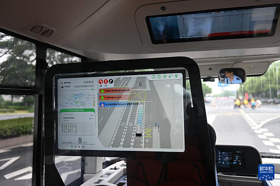 5月22日,自動駕駛接駁示范線巴士行駛在杭州余杭未來科技城的道路上,車內(nèi)配備的屏幕可實時顯示路面及駕駛信息。