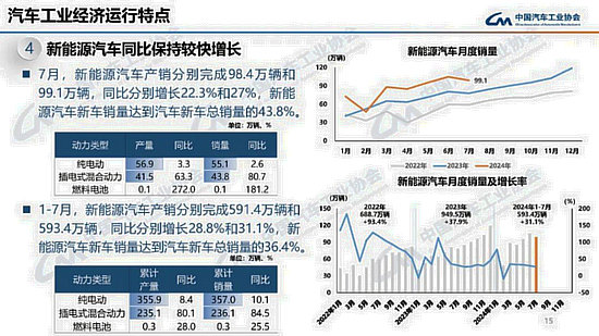 在新能源汽車方面,1-7月,新能源汽車產(chǎn)銷分別完成591.4萬輛和593.4萬輛,同比分別增長28.8%和31.1%,新能源汽車新車銷量達到汽車新車總銷量的36.4%。7月,新能源汽車產(chǎn)銷分別完成98.4萬輛和99.1萬輛,同比分別增長22.3%和27%,新能源汽車新車銷量達到汽車新車總銷量的43.8%。