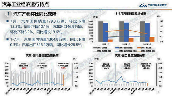 8月9日,中國汽車工業(yè)協(xié)會發(fā)布2024年7月汽車工業(yè)產(chǎn)銷情況。數(shù)據(jù)顯示,7月,汽車產(chǎn)銷分別完成228.6萬輛和226.2萬輛,環(huán)比分別下降8.8%和11.4%,同比分別下降4.8%和5.2%。據(jù)中國汽車工業(yè)協(xié)會分析,7月,車市進入傳統(tǒng)淡季,部分廠家迎來高溫休假,產(chǎn)銷節(jié)奏有所放緩,整體市場表現(xiàn)相對平淡,環(huán)比同比均呈現(xiàn)下降。其中,乘用車和商用車產(chǎn)銷環(huán)比同比雙降,新能源汽車和汽車出口同比繼續(xù)保持較快增長。
