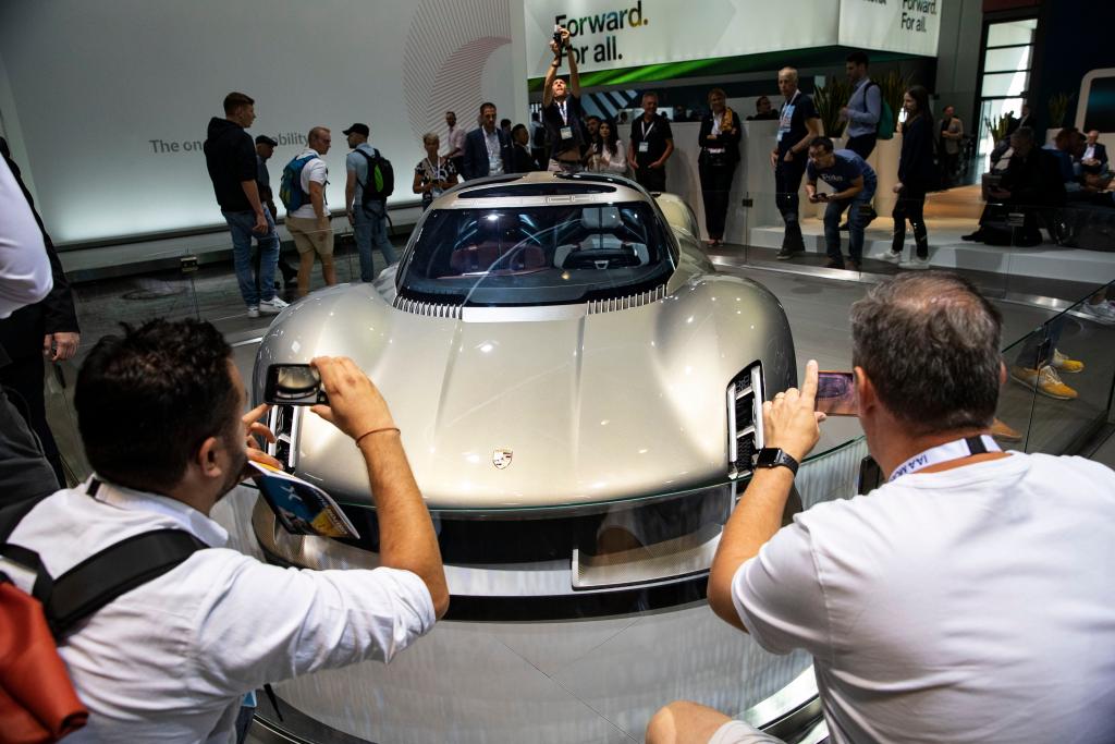 2023年9月5日,在德國慕尼黑,人們在德國國際汽車及智慧出行博覽會上拍攝一款保時捷展車。新華社記者張帆攝
