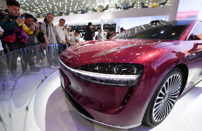 (資料照片)4月25日,參觀者觀看2024北京車展上發(fā)布的享界S9。新華社記者 鞠煥宗 攝