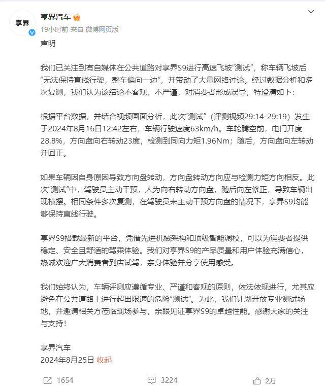 8月25日,針對享界S9高速飛坡“測試”一事,享界汽車通過微博官方賬號發(fā)表聲明,表示已關(guān)注到有自媒體在公共道路對享界S9進行高速飛坡“測試”,稱車輛飛坡后“無法保持直線行駛,整車偏向一邊”,并帶動了大量網(wǎng)絡(luò)討論。