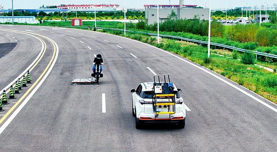測試車輛在天津(西青)國家級車聯(lián)網(wǎng)先導(dǎo)區(qū)封閉測試場內(nèi)進(jìn)行自動(dòng)駕駛主動(dòng)安全功能測試 (2024年6月14日攝) 孫凡越攝