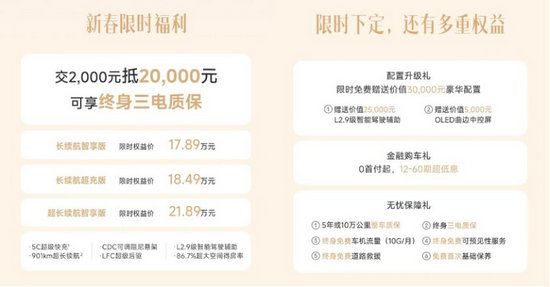 據(jù)悉,2月28日前下定嵐圖知音,用戶還能享受“2000元抵20000元”的福利政策,17.89萬起的價(jià)格就能入手。在此基礎(chǔ)上,嵐圖知音官方還推出包括終身三電質(zhì)保的三大購車好禮。同時(shí),還能疊加2025年國補(bǔ)政策。