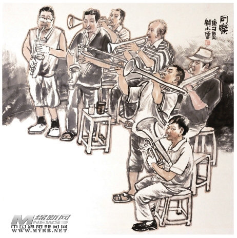 再如一幅《同樂》,是在綿陽人民公園看到的。一群老人,每天都會帶著樂器自發(fā)聚集在一起,吹拉彈唱,自娛自樂,那份怡然自得,透露出老人們樂觀而豁達的生活態(tài)度。這樣的場景,鮮小云每次走進人民公園都會看到,以至于2020年在創(chuàng)作這一幅畫時,所有的細節(jié)都信手拈來。