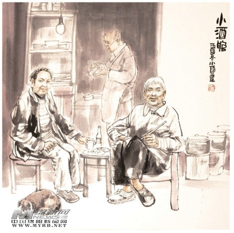 在展覽作品中,最引人注意的是一組市井生活圖像。比如那幅《小酒館》,是鮮小云2018年在三臺縣城采風(fēng)時看到的,老板正在酒館里夾豬毛,門口兩位食客正在喝酒,一個抽旱煙,一個身旁就是蜂窩煤爐子,“環(huán)境實在是有點差,但畫中的人都很滿足”。鮮小云說,現(xiàn)在人們的生活好了,但很多人卻越來越難以感覺到幸福,畫中老人們的幸福感是“有點小酒喝就知足了”,其實這就是幸福,“越簡單越幸福”。