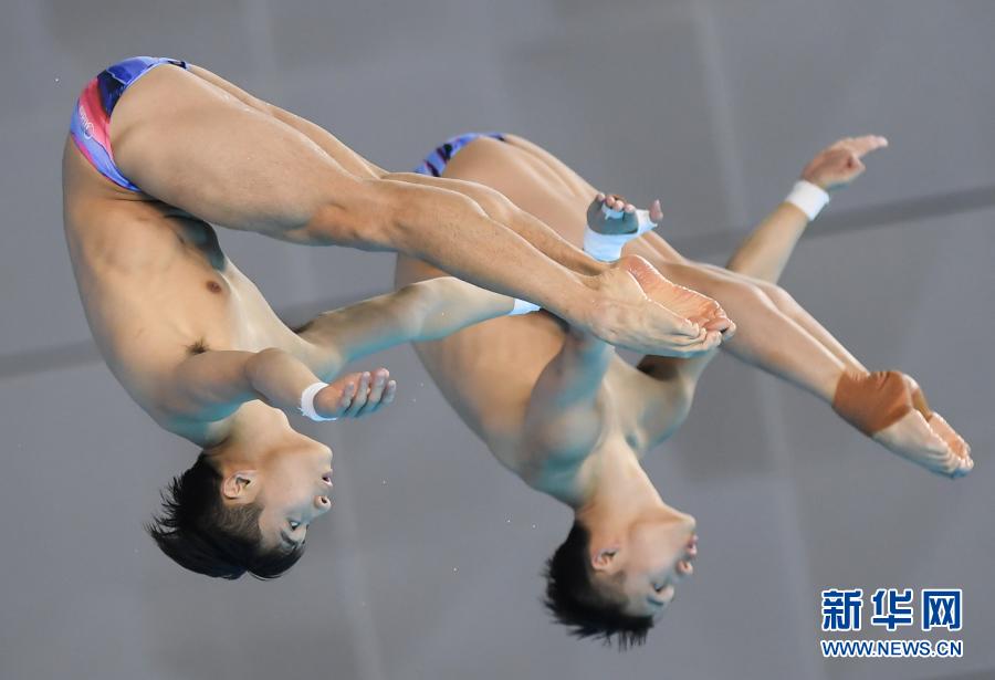 1月21日,廣東海印隊(duì)選手陳艾森/北京水立方隊(duì)選手曹緣(左)在男子雙人10米跳臺(tái)決賽中。最終,他們以482.73分的成績(jī)獲得冠軍。