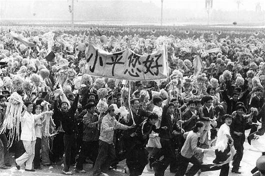 1984年10月1日國(guó)慶大閱兵之后各方陣陸續(xù)前進(jìn),當(dāng)參加國(guó)慶游行的大學(xué)生通過(guò)天安門時(shí),隊(duì)伍中突然展開(kāi)了“小平您好”的橫幅,這一表達(dá)億萬(wàn)人民心聲的標(biāo)語(yǔ),永遠(yuǎn)被歷史定格。人民日?qǐng)?bào)記者 王東 攝
