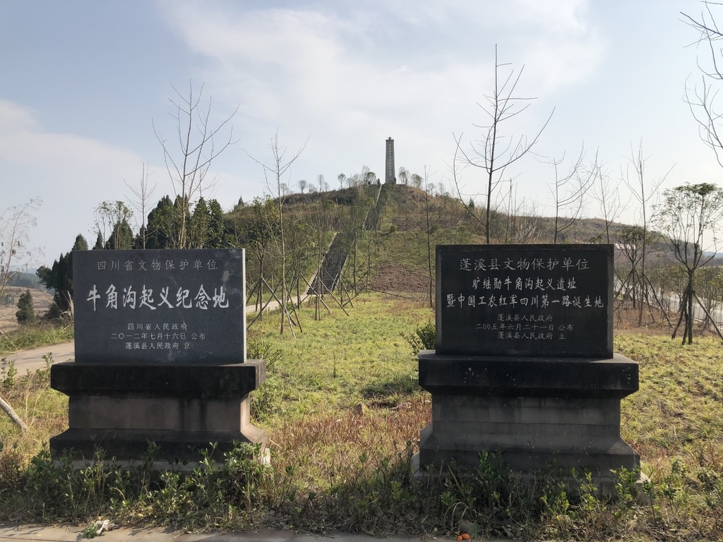 1990年4月,徐向前元帥為遺址題寫“曠繼勛牛角溝起義紀念碑”。2019年,為紀念蓬溪起義90周年,蓬溪縣委、縣政府在遺址處重建了徐向前元帥題寫的“曠繼勛牛角溝起義紀念碑”,豎起了“四川紅軍第一村”標志牌。目前,遺址已經(jīng)成為人們緬懷革命先烈豐功偉績、開展黨性教育和學習鄉(xiāng)村振興經(jīng)驗的重要基地。