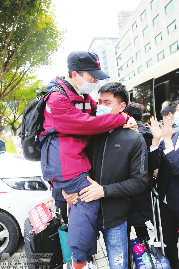 2020年4月1日11時許,我市援湖北醫(yī)療隊首批20名隊員結(jié)束“逆行”返綿。警車開道,鐵騎護(hù)航,綿陽用最高禮遇迎接英雄平安歸來。醫(yī)療隊隊員、三醫(yī)院神經(jīng)內(nèi)科90后護(hù)士馮瀟瀟與闊別52天的老公緊緊相擁,這一刻,幸福和喜悅化作淚水,奪眶而出。