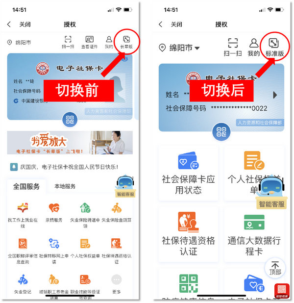 在“貼心養(yǎng)老”版塊,電子社??ㄩL(zhǎng)輩版將頁(yè)面化繁為簡(jiǎn)、按鈕放大,為老年人帶來(lái)更貼心的服務(wù)。用戶(hù)只要打開(kāi)“i綿陽(yáng)”APP中的電子社保卡,點(diǎn)擊右上角“長(zhǎng)輩版”按鈕,就能成功切換。