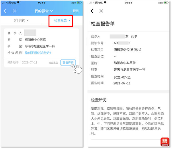 在“健康管理”版塊,推出電子檢查報(bào)告,市政務(wù)服務(wù)監(jiān)督管理局有關(guān)負(fù)責(zé)人表示,檢查報(bào)告單查詢(xún)是記錄就診人每次檢查檢驗(yàn)后的電子檔案,完整記錄各項(xiàng)檢查、時(shí)間、檢查項(xiàng)目、結(jié)果等重要信息,避免老年人就醫(yī)重復(fù)檢查的情況,方便醫(yī)生進(jìn)行診療。用戶(hù)只需打開(kāi)“i綿陽(yáng)”APP首頁(yè),在頂部搜索欄輸入“檢驗(yàn)檢查報(bào)告”,選擇已就診過(guò)的醫(yī)院,查詢(xún)今天、一個(gè)月內(nèi)、6個(gè)月內(nèi)的檢驗(yàn)報(bào)告和檢查報(bào)告,點(diǎn)擊“查看詳情”即可查看檢查報(bào)告單。