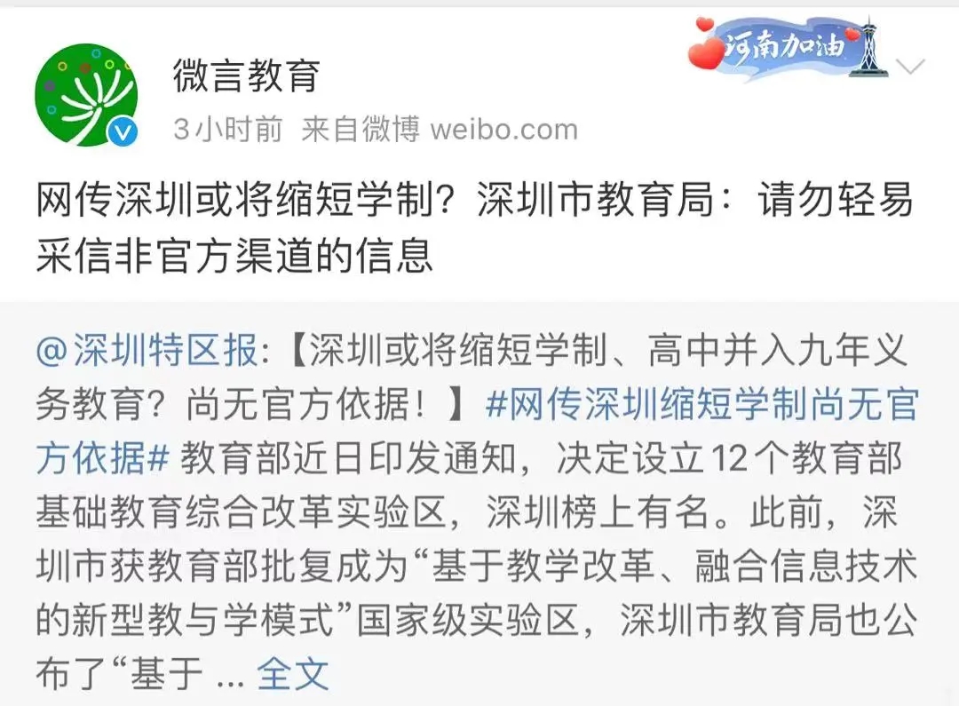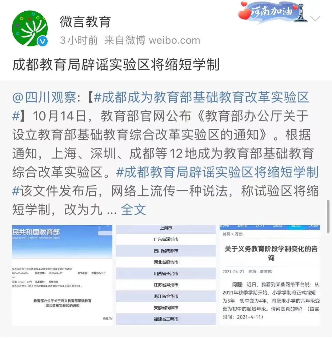 澎湃新聞注意到,目前深圳、成都、西安及浙江等多地教育部門對教育部基礎(chǔ)教育綜合改革實驗區(qū)將縮短學(xué)制的說法已辟謠。