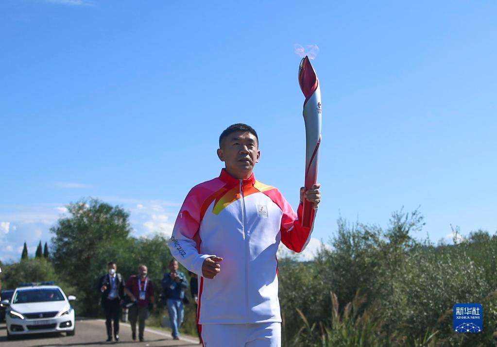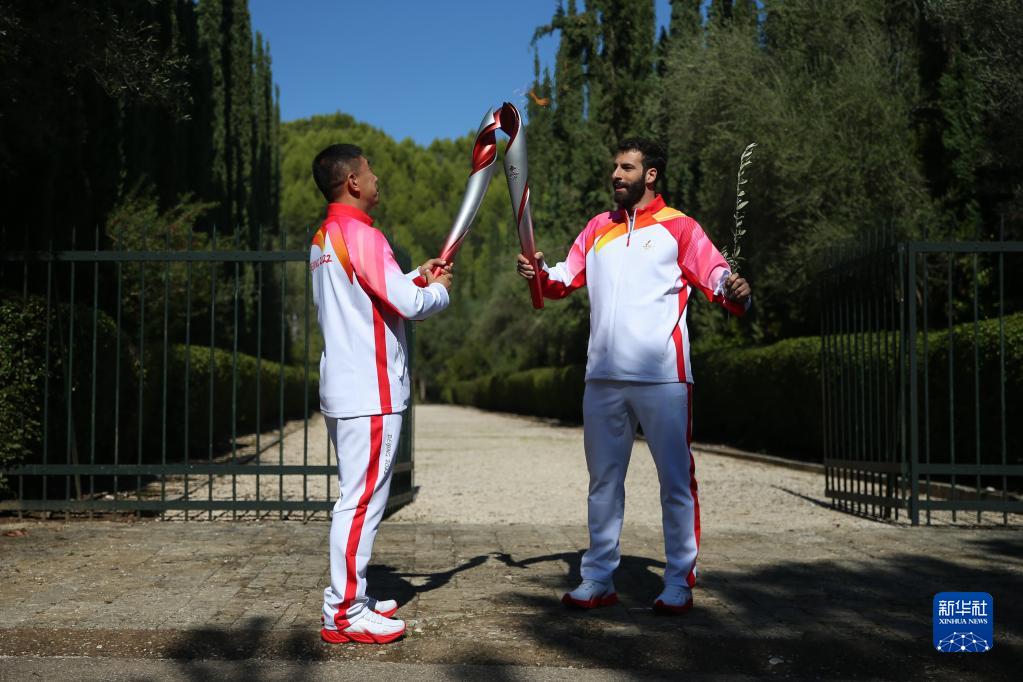 10月18日,希臘高山滑雪運(yùn)動(dòng)員揚(yáng)尼斯·安東尼烏(右)將火種傳遞給第二名火炬手——前中國短道速滑運(yùn)動(dòng)員李佳軍。