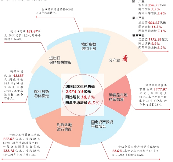 從總量上看,今年前三季度,綿陽地區(qū)生產(chǎn)總值2374.34億元;從增速看,同比增長10.1%,兩年平均增長6.5%。
